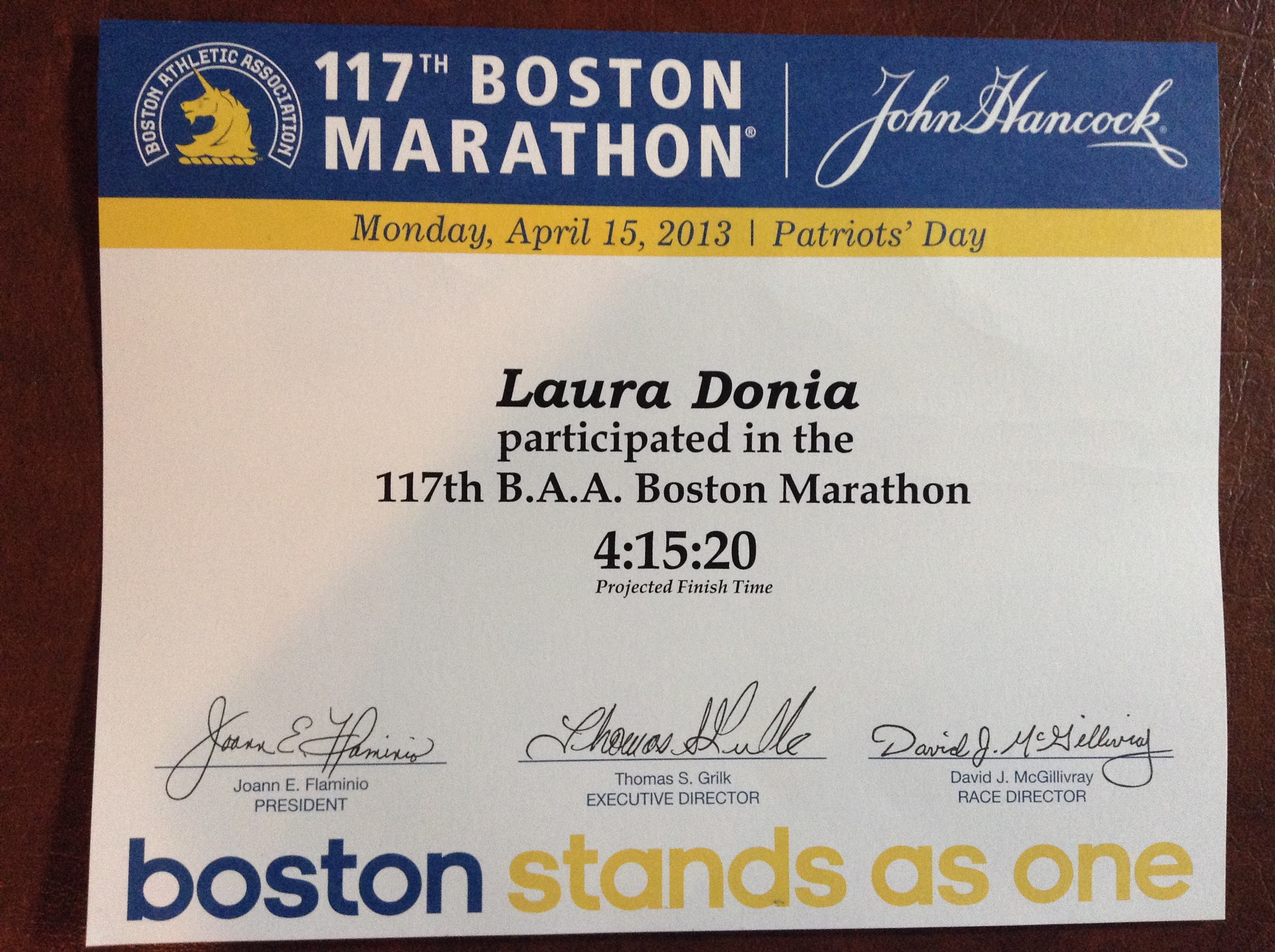 My 117th Boston Marathon Racers’ Record Book, along with my “projected” finisher’s certificate, arrived in the mail today, stirring up a lot of mixed emotions. Instead of the words “successfully completed the 117th B.A.A. Boston Marathon” under my name on the certificate, it says “participated in the the 117th B.A.A. Boston Marathon”. For the first time in the history of the marathon, there are two sets of results in the record book; one set for “official” finishers and a second set for “projected” finishers. My name can be found in the record book listed with more than 5600 other “projected” finishers.