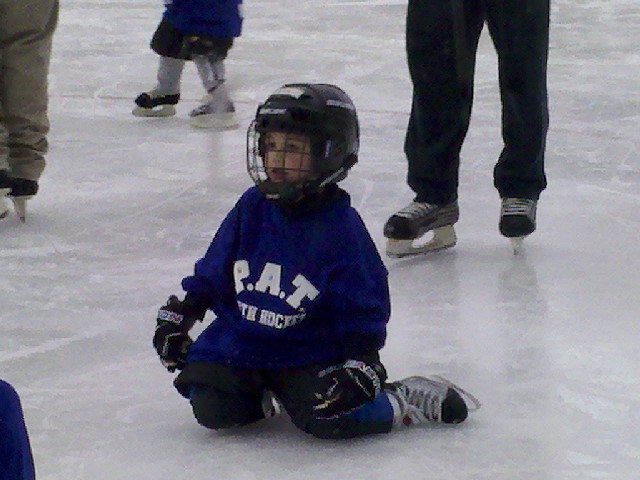 All the kids – 3,4, 5 years old – were set loose on the ice at once, many of them on skates for the first time in their young lives. Ashton caught on pretty quick and could at least stand and shuffle along, and stay upright most of the time. And when he did fall, he could pick himself back up. Ryan not so much. He spent much of that first day crawling on the ice, crying, wanting to come off. He and a few other kids were allowed to come off the ice to learn some ‘skills’ that will help them on the ice. They started waddling around on their skates, quacking like ducks. Really?